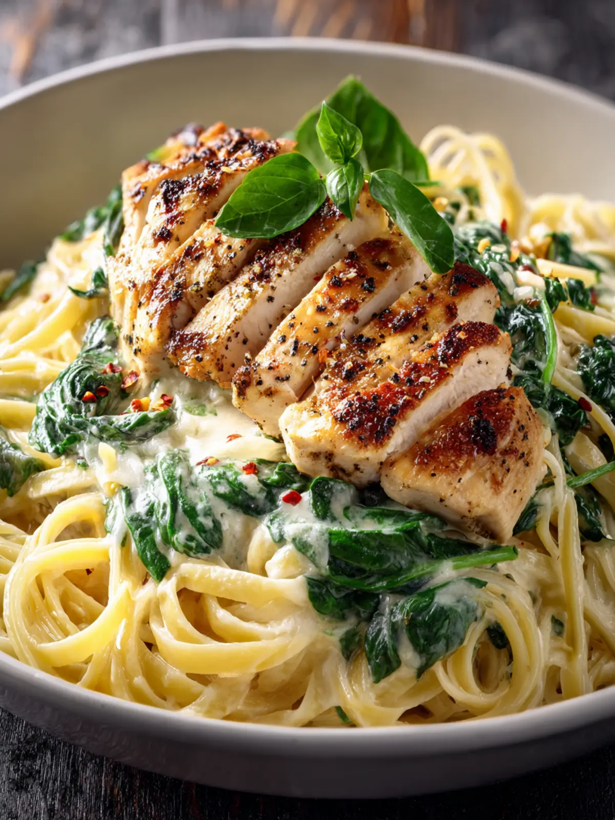 A rich and creamy pasta dish featuring tender chicken and fresh spinach.