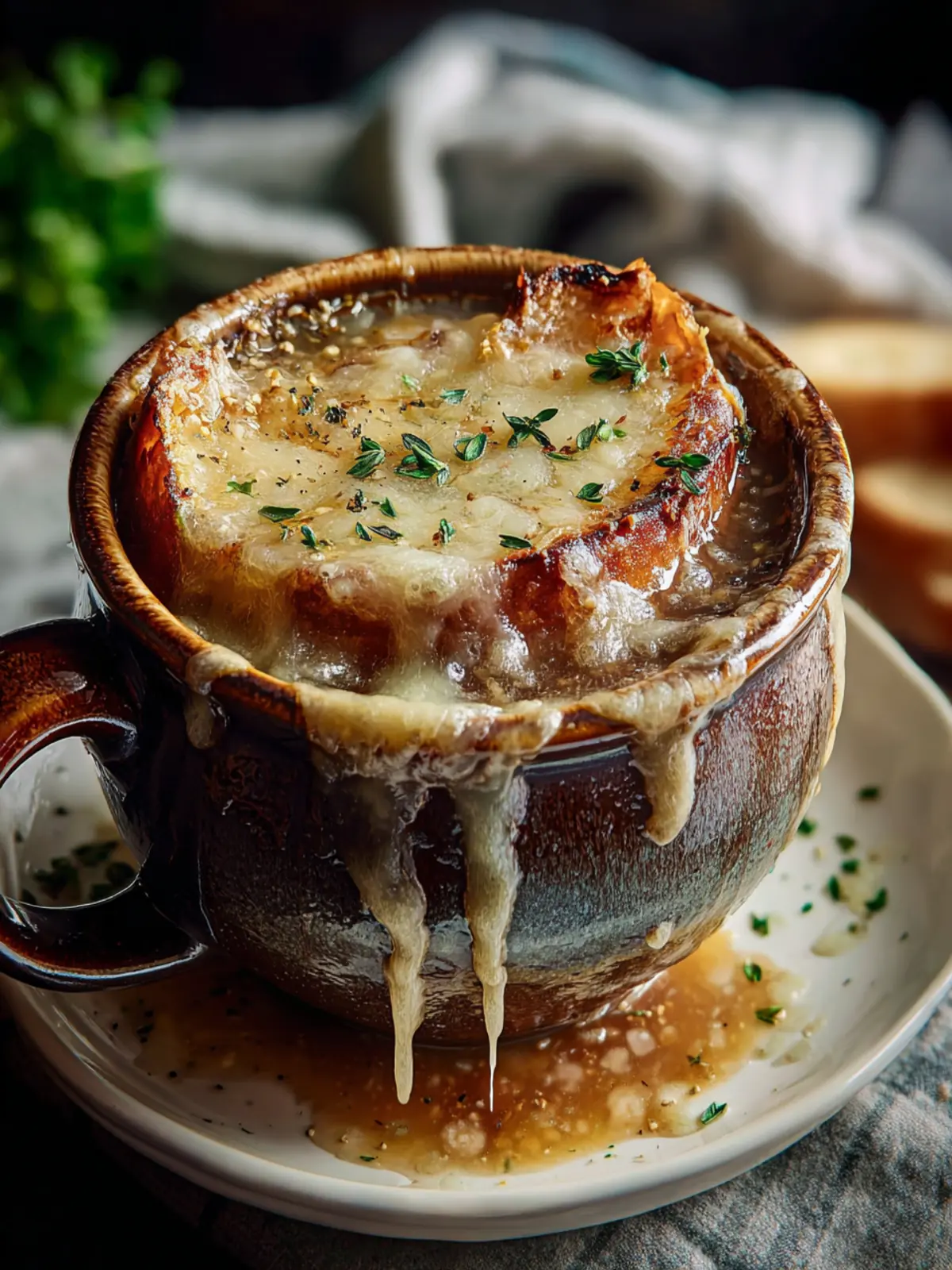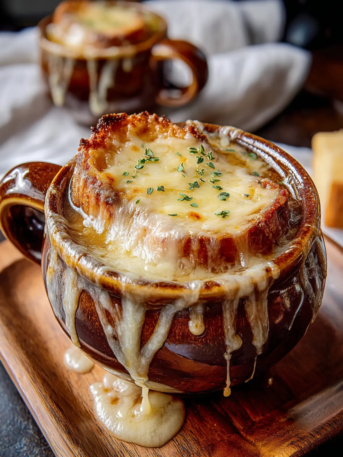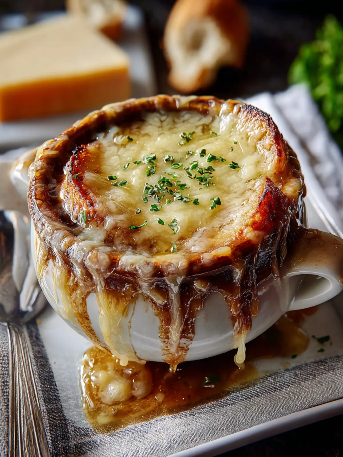 Gruyère Cheese: This Swiss cheese tops your soup, melting beautifully to create a gooey, golden crust that simply invites you in for a spoonful.