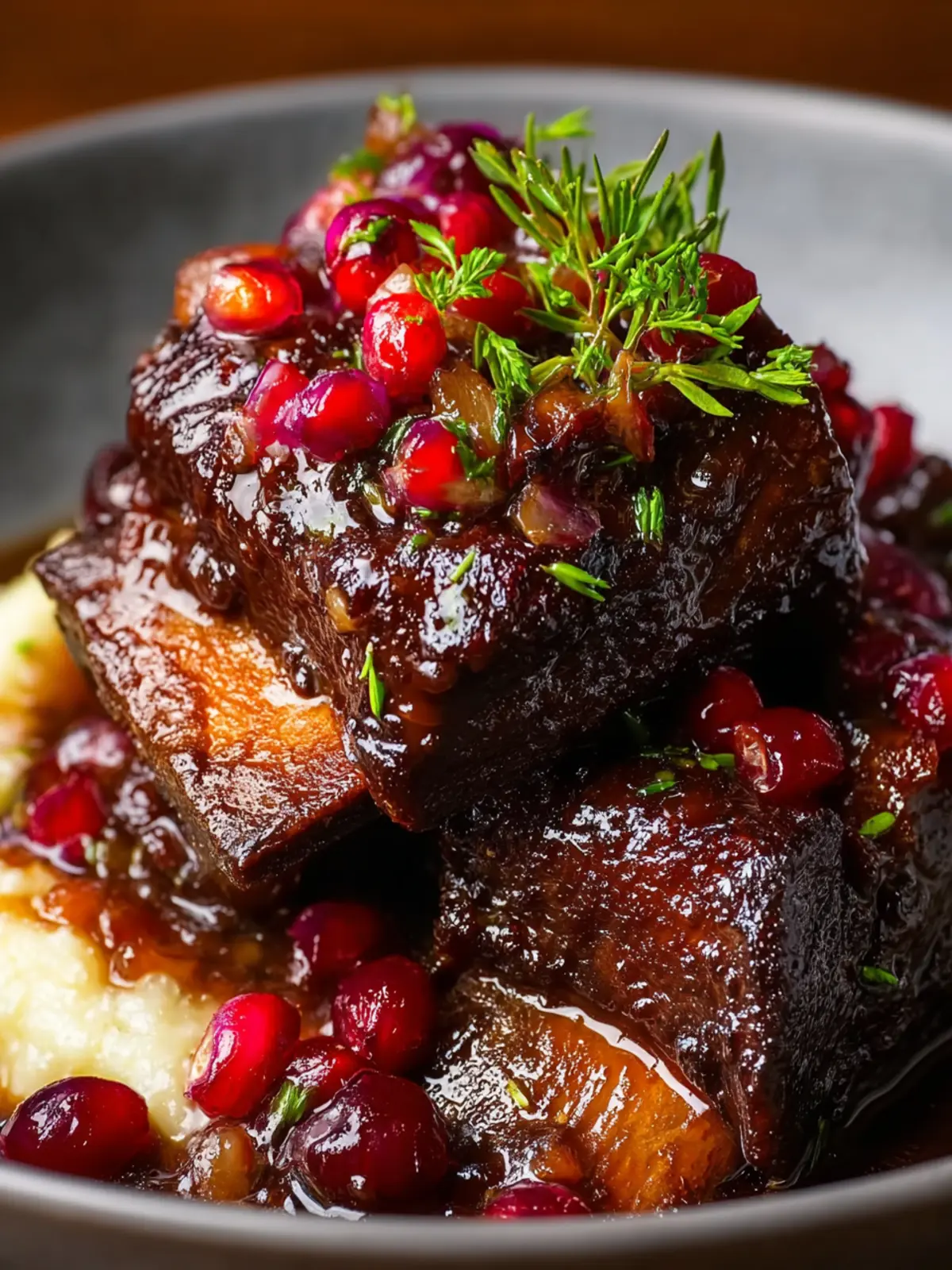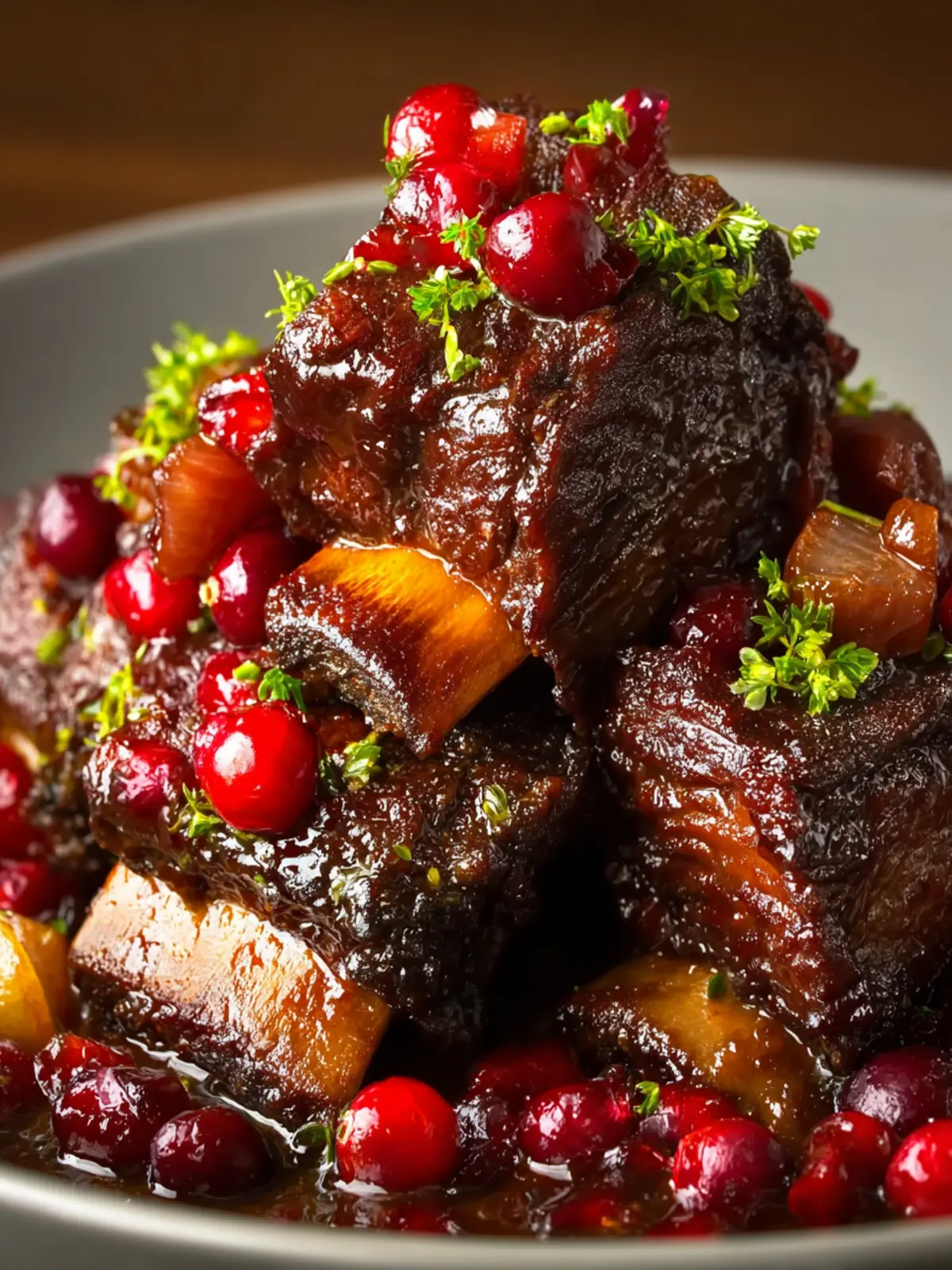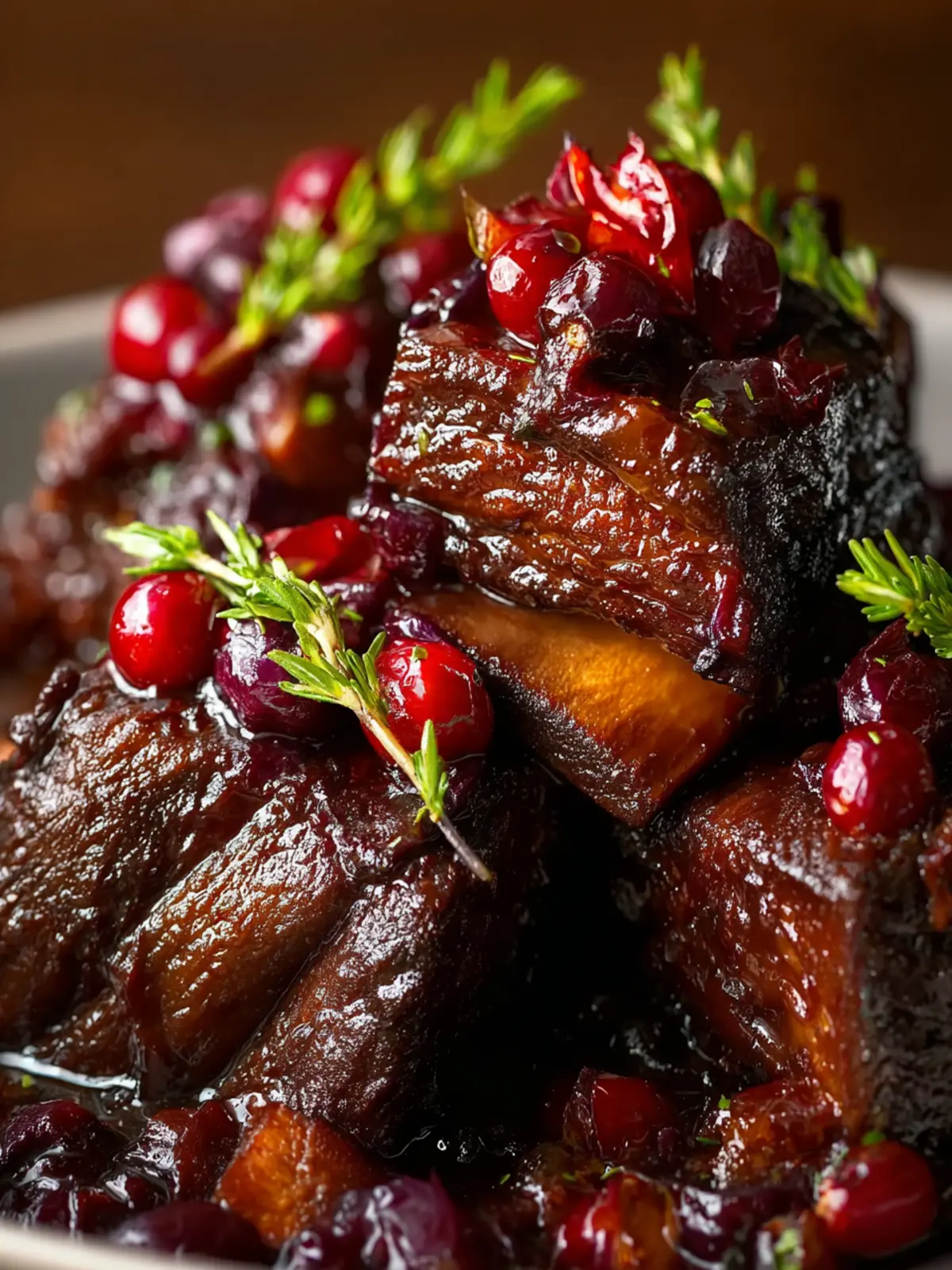 - Spoon the warm cranberry sauce over the short ribs, garnish with freshly chopped parsley, and serve hot.