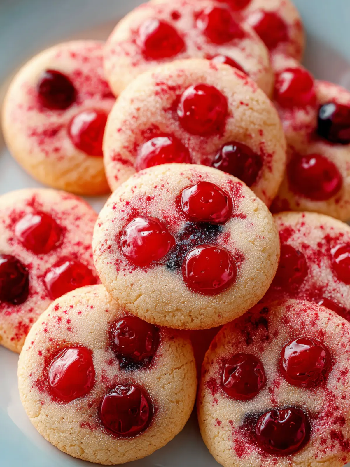 If you’re feeling creative, sprinkle some festive colored sugar or sprinkles on top of the cookies before baking. It adds an attractive touch that complements the cherries nicely.