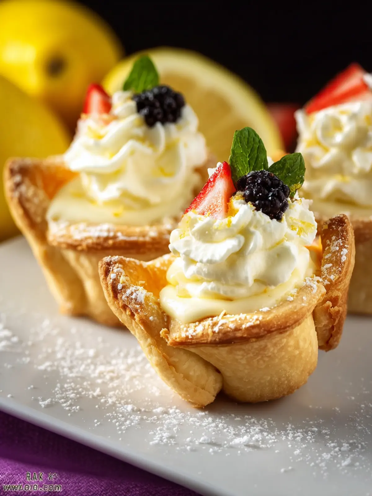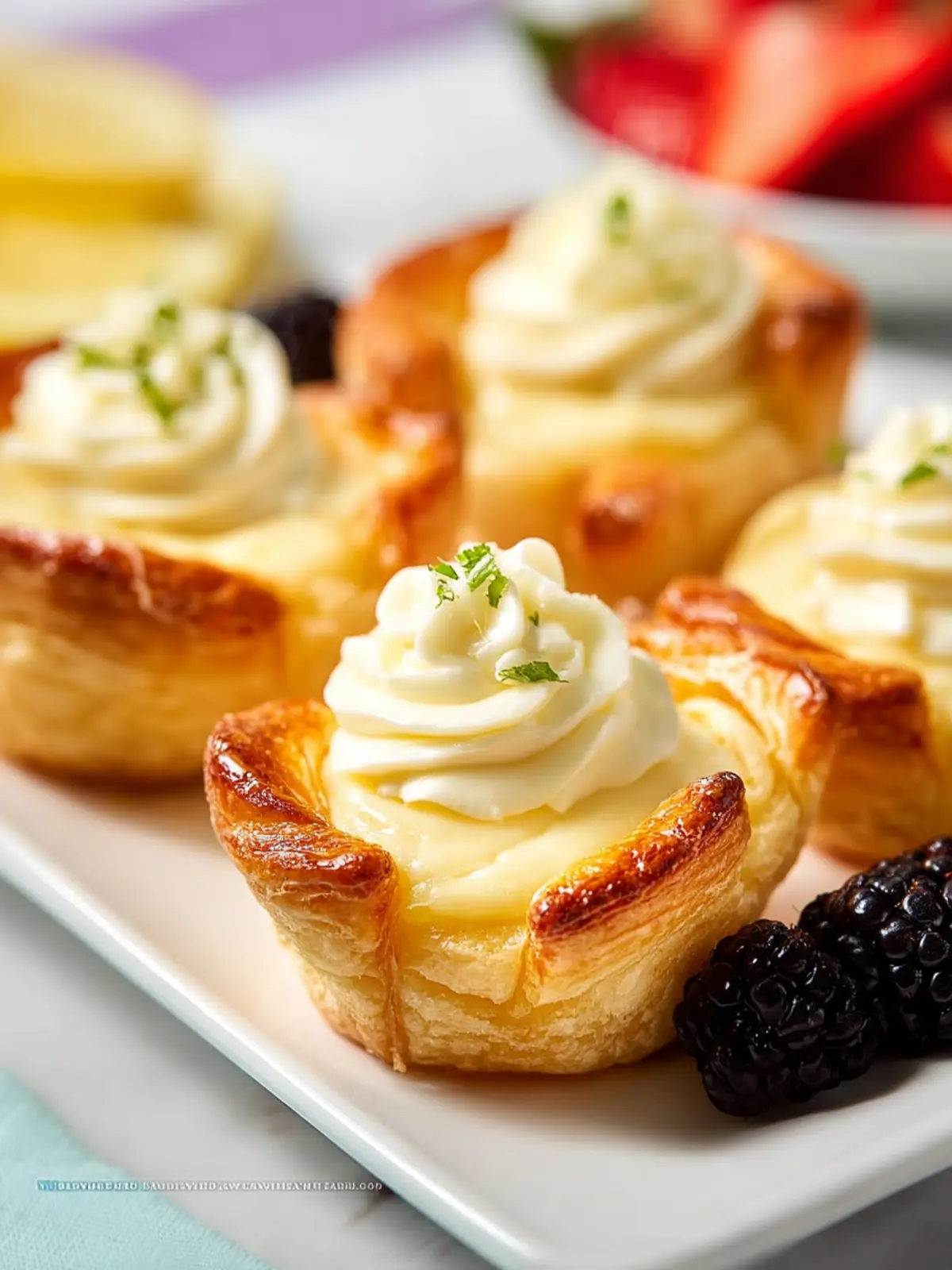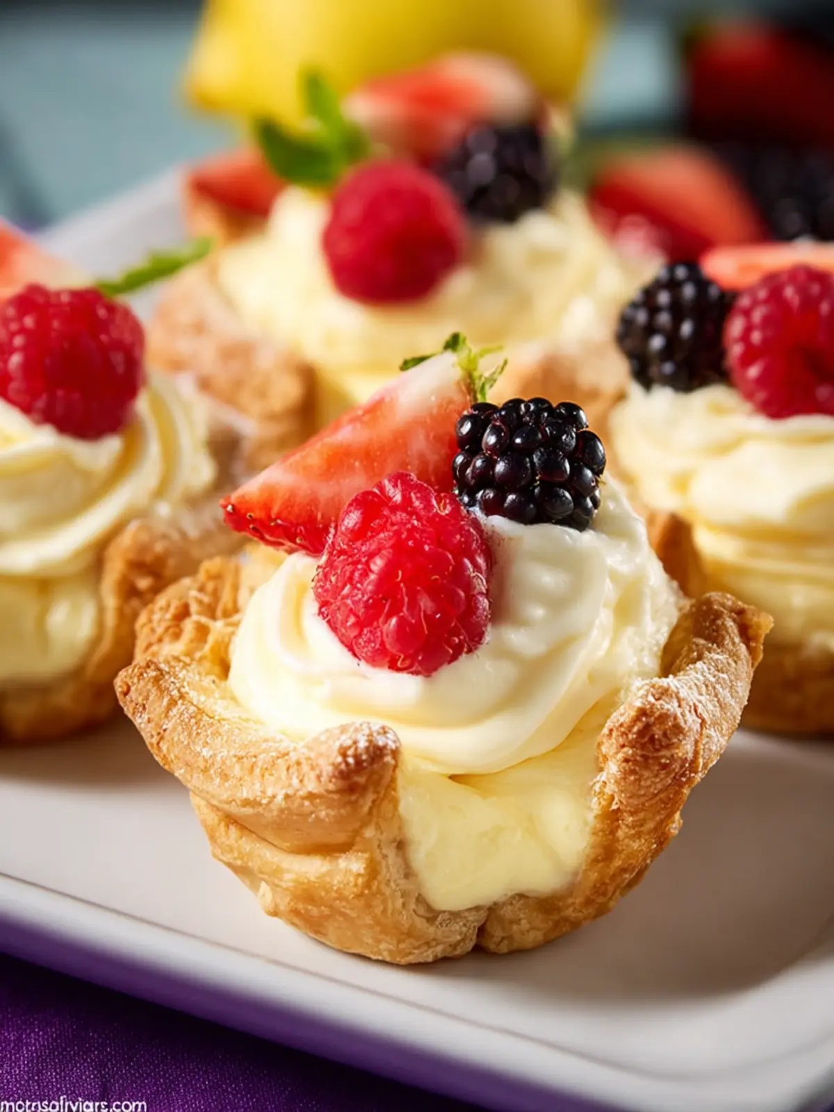 Delicious lemon cheesecake filling in flaky crescent cups, topped with fresh fruit or a sprinkle of lemon zest.