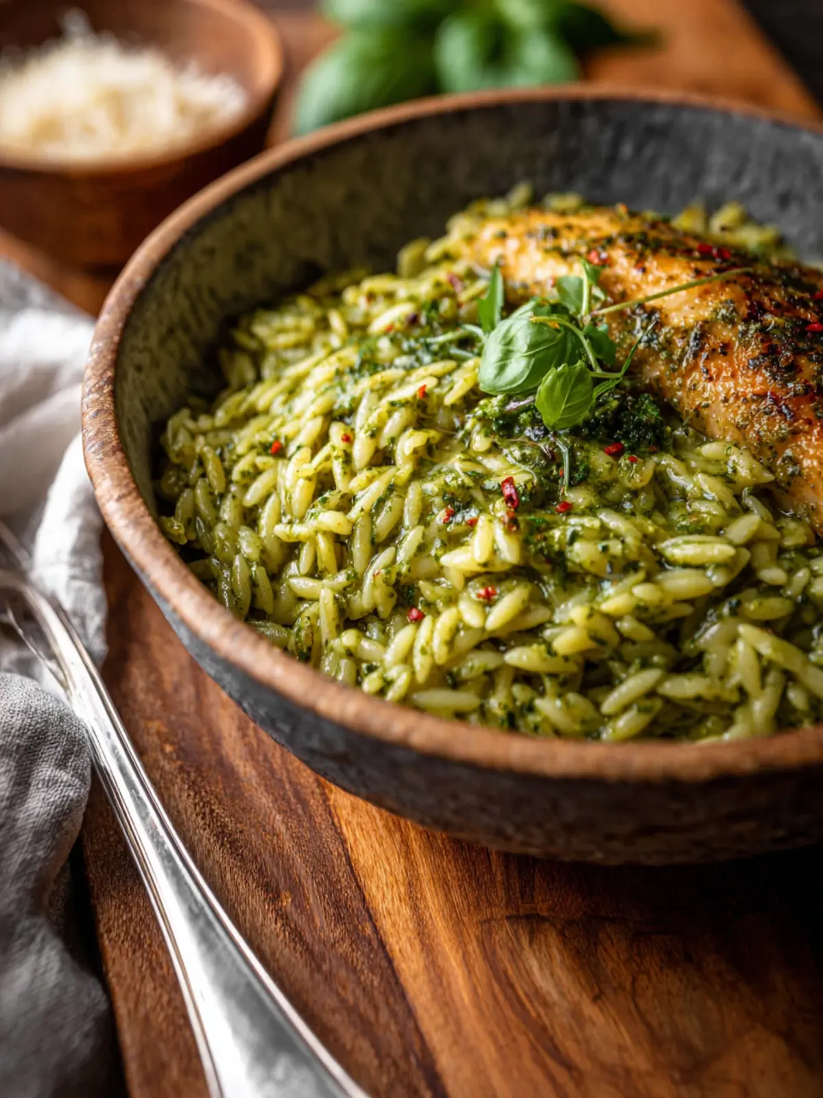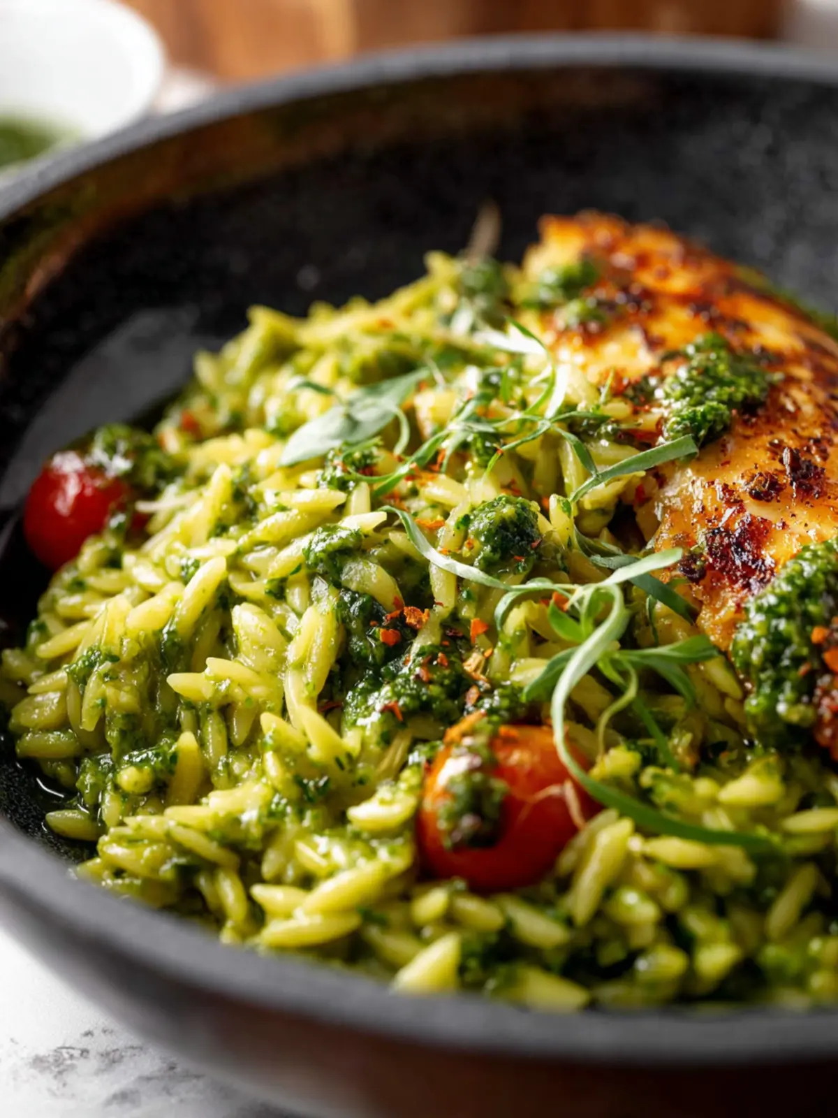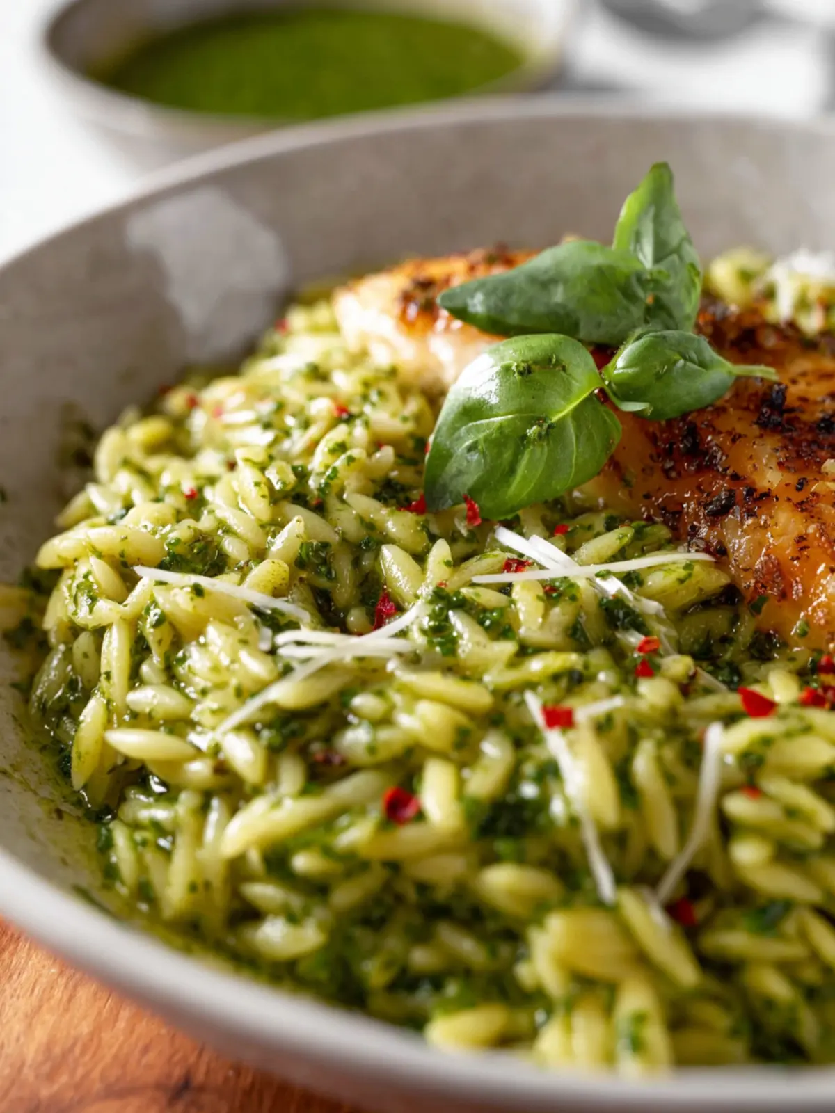 Feeling adventurous? A sprinkle of red pepper flakes or a dash of smoked paprika can add a lovely warmth to your creamy pesto orzo. Just a little can completely transform the dish and make it even more exciting to enjoy.