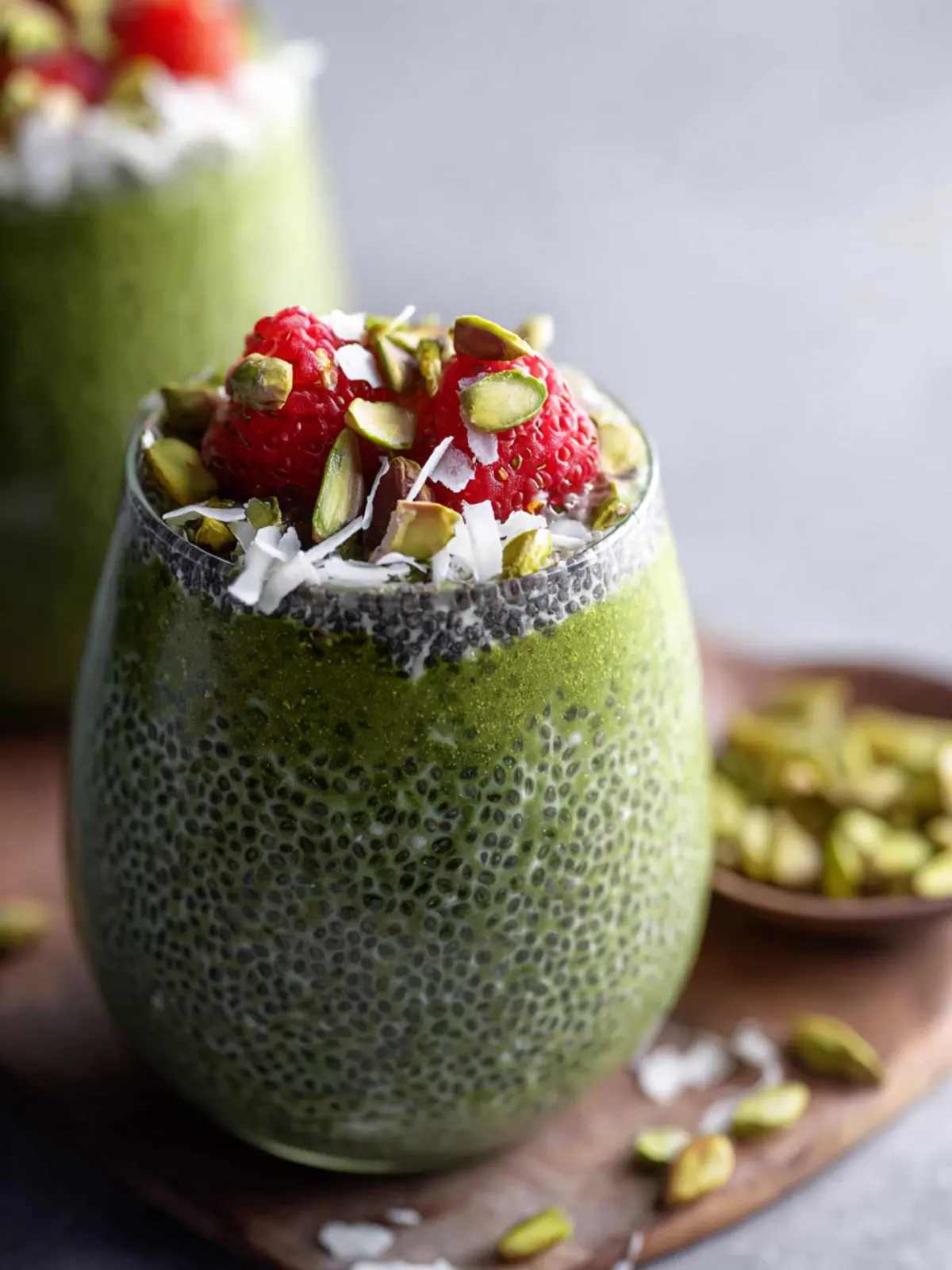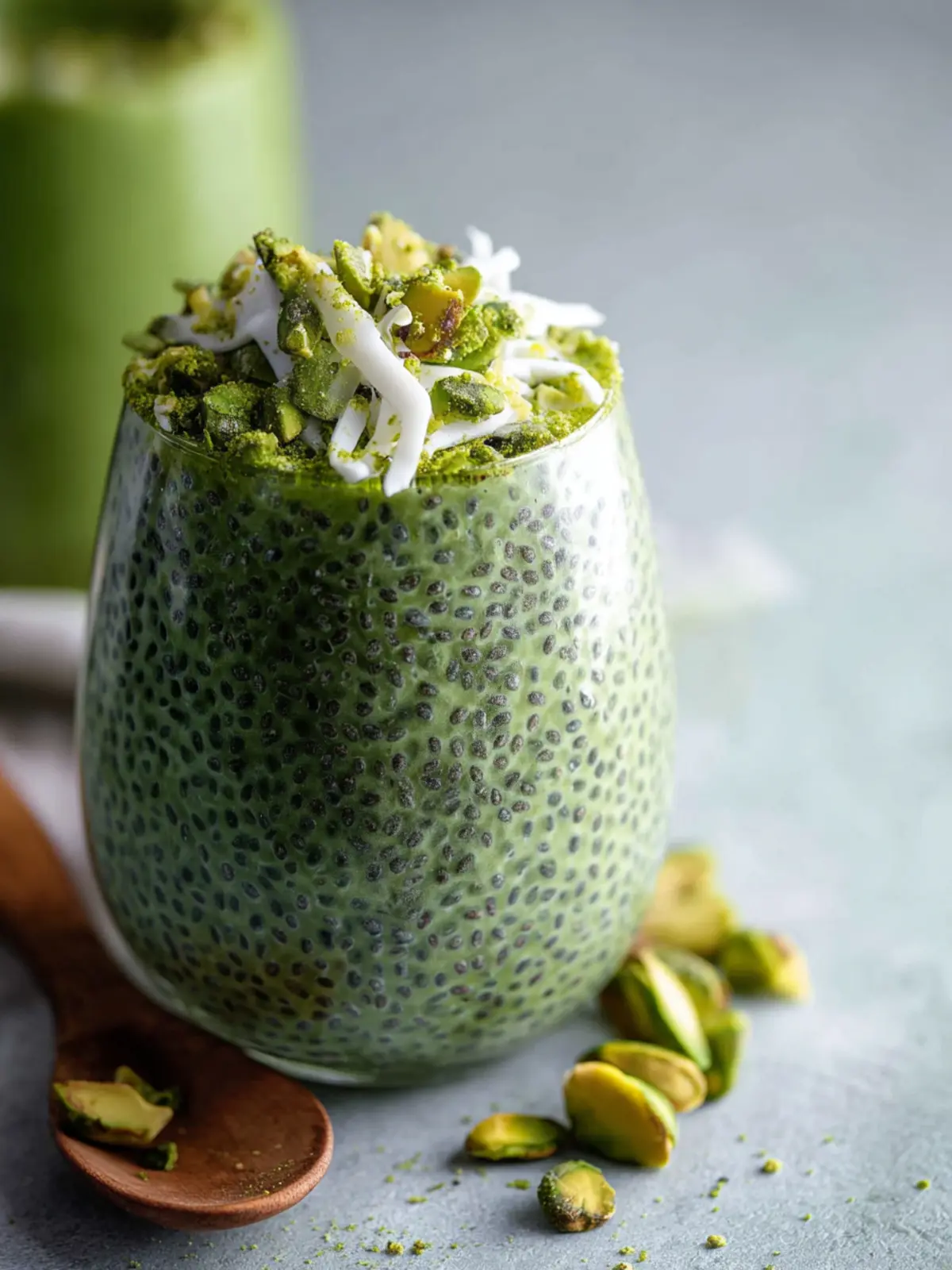 This creamy chia pudding is enriched with non-dairy milk, pistachios, and matcha for a nutritious and delicious treat.