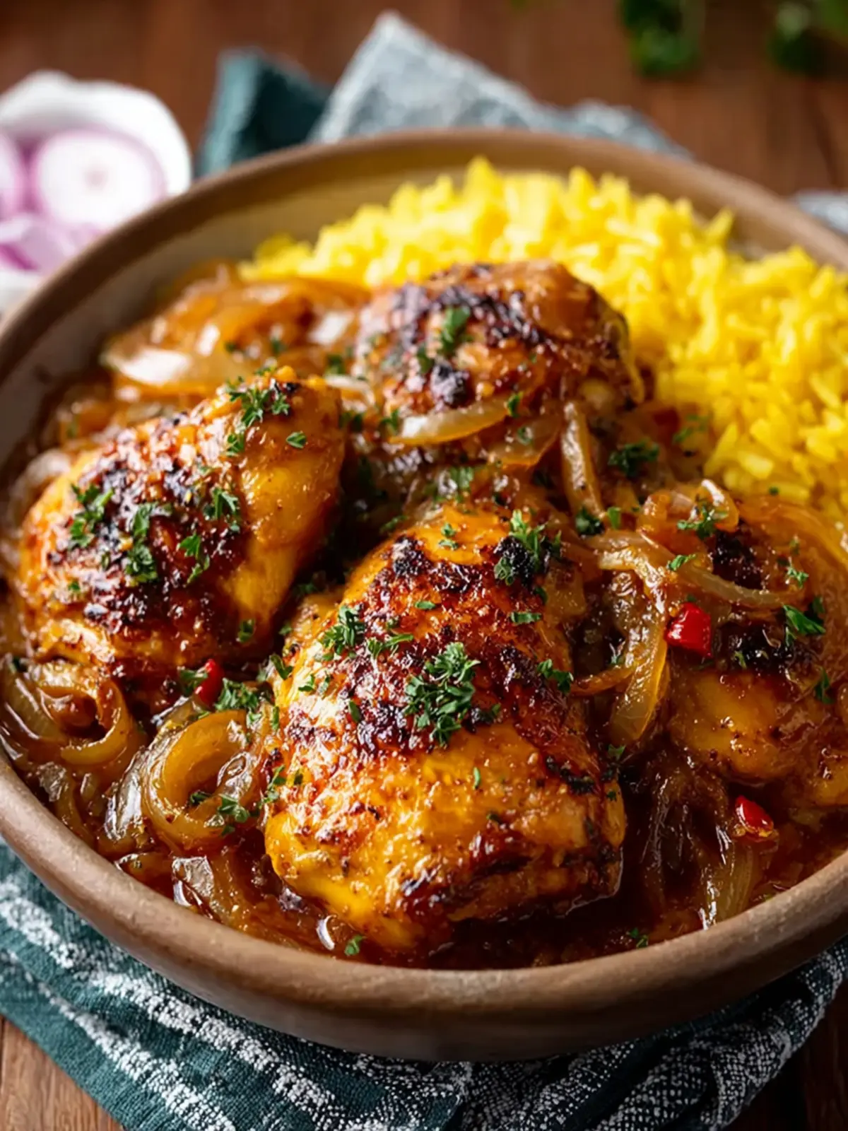 A savory and tangy dish featuring marinated chicken thighs and caramelized onions, perfect for serving over rice.