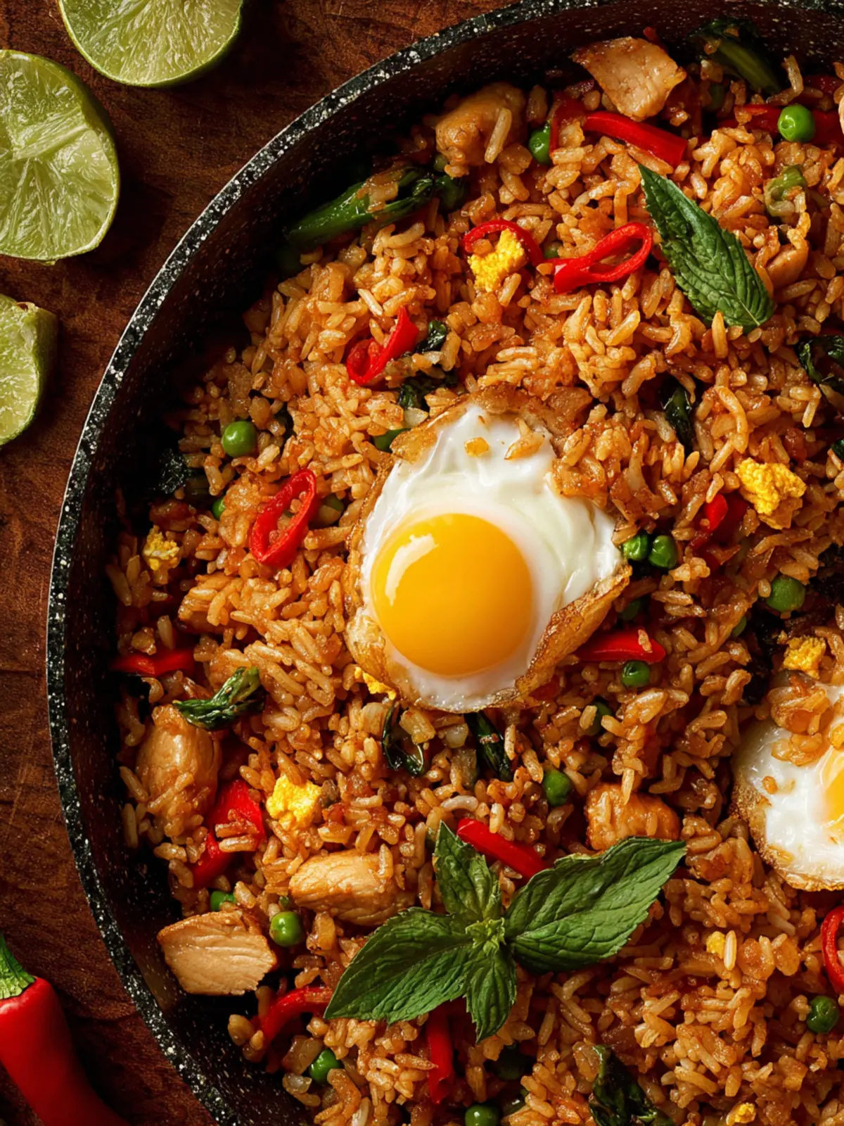 A delicious and spicy Thai red curry fried rice topped with fried eggs and served with lime wedges.